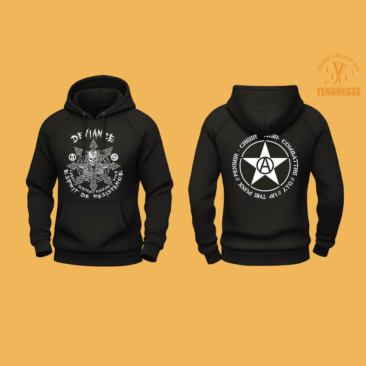 T-SHIRT noir / recto logo DEVIANCE / verso étoile anarchie + Penser – Créer – Agir – Combattre – D.I.Y – UP THE PUNX ! Taille XL